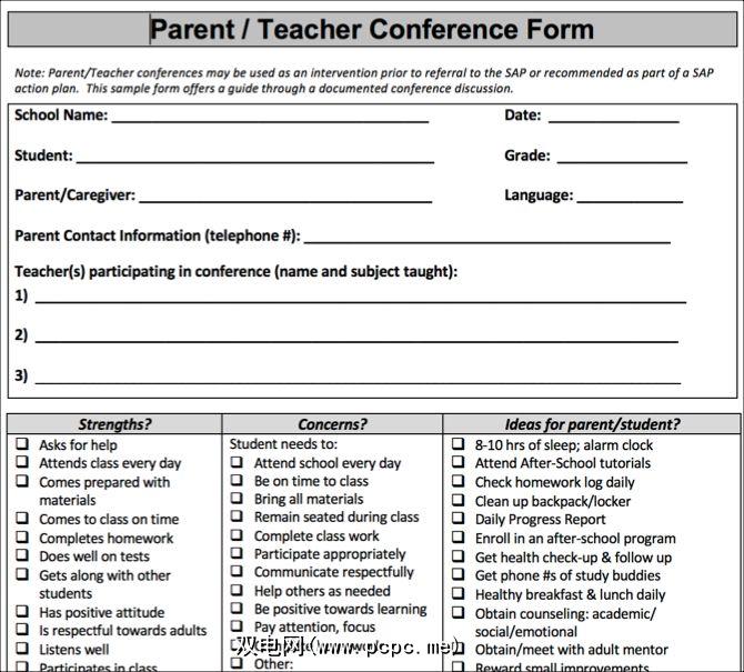 表格的顶部具有学校,学生以及父母或监护人姓名的所有基础知识。它是表格的底部,使事情变得简单。优点,关注点和想法分为三个部分。您可以标记每个部分中适用的项目的框,在每个部分中添加注释,并在底部添加更多注释。
