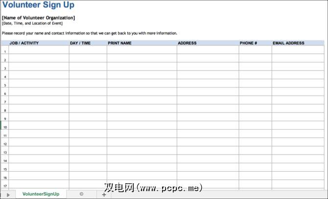 在以下方面寻求帮助时在教室里,有捐赠的物品或计划进行实地考察,您可能需要求助于父母和监护人。此Microsoft Excel的志愿者注册工作表模板适用于大多数类型的活动或事件。