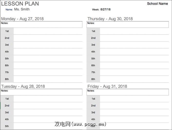 输入星期几时,计划中的日期和日期会自动调整。每天的顶部都有一个用于放置笔记的地方,最后还有一个较大的地方。如果您使用每周计划来上课,那么您会喜欢此Excel模板。