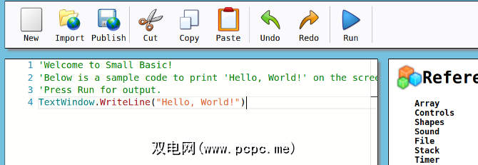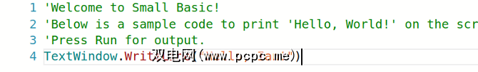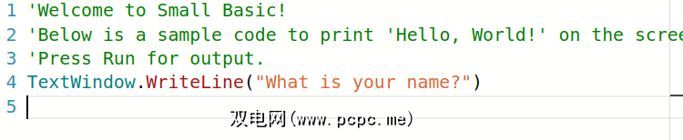 这是Microsoft Small Basic IDE的在线版本。在线IDE是一个您可以在其中编写代码并对其进行测试的地方。如您所见,文本窗口中已经有一些代码。按蓝色的三角形运行按钮查看代码的作用。