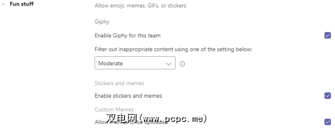 Microsoft Teams Setting具有“ 有趣的东西"选项。有什么好玩的?好吧,表情符号,模因,GIF和贴纸,当然。 “有趣的东西"设置允许团队所有者关闭自定义模因(与非自定义模因相反),表情符号,贴纸和GIF的上传。希望您不必走那么远,不过尽管如此,还是有选择的。