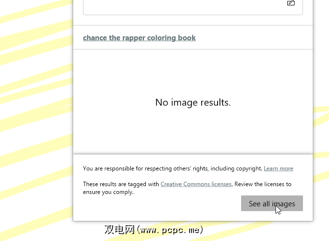 默认情况下,图像结果将受到限制,因为该应用会将您的结果限制为非版权图像。要查看所有图像,请单击提示底部的查看所有图像选项。