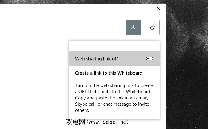 右侧的灰色图标允许您创建一个可以共享的Web链接。在同一个Whiteboard项目中与其他人合作。请注意,必须启用以下所示的关闭网络共享链接选项才能创建链接。