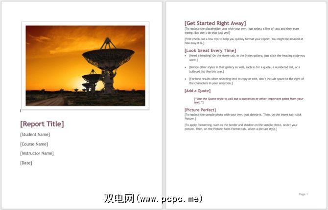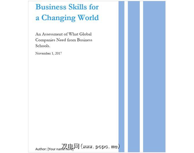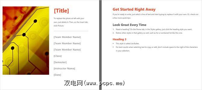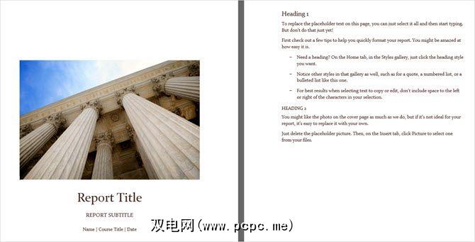 要获得更紧凑的封面选项,其中还包括第二页, Microsoft Office为您提供了一个不错的模板。与其他封面一样,您可以使用照片或图像来增强报告主题。插入您的标题和副标题,然后输入您的姓名,课程名称和日期。