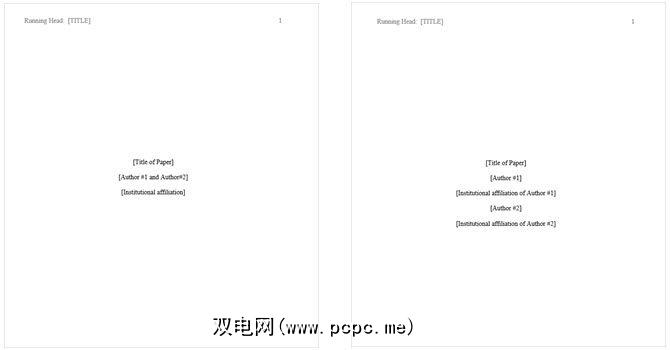 这两个都适用于两位作者的论文。它简单明了,并带有标题,名称,隶属关系或机构名称的位置。您会注意到,唯一的区别是从属关系。一个用于同一机构内的作者,另一个用于具有不同隶属关系的作者。