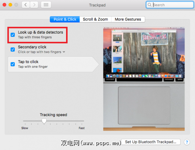 在启动应用程序之前,您需要禁用Mac的 Look Up 手势(macOS分配了三指点击功能)在触控板上)。转到系统偏好设置>触控板,然后单击指向并单击选项卡。
