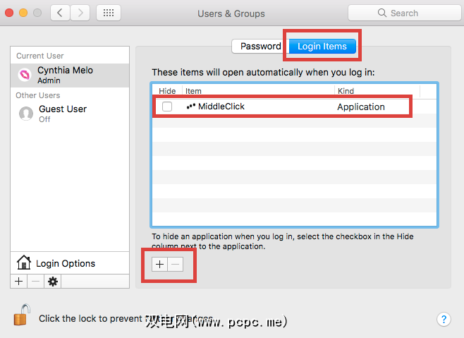 最后,您需要将MiddleClick设置为在登录时运行。转到系统偏好设置>用户和组。突出显示您的用户名,然后单击登录项标签。点击 + 图标,然后从应用程序列表中选择MiddleClick。
