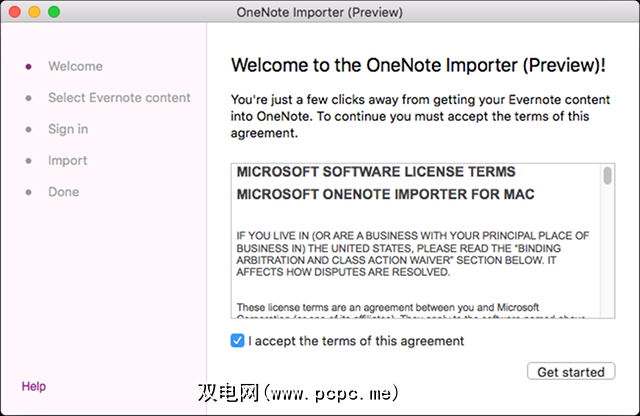 下一步,运行 OneNote Importer.app ,接受条款和条件,然后单击< strong>入门。