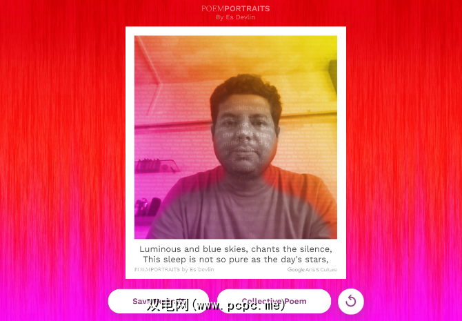 接下来,该应用程序要求您使用网络摄像头或手机进行自拍照。然后,它向您显示两行诗的最终输出,该诗也变成了您的自拍画。这些单词遍布您的脸部形状,并应用了一些过滤器,使之成为您脸部和自己诗歌的独特自画像。