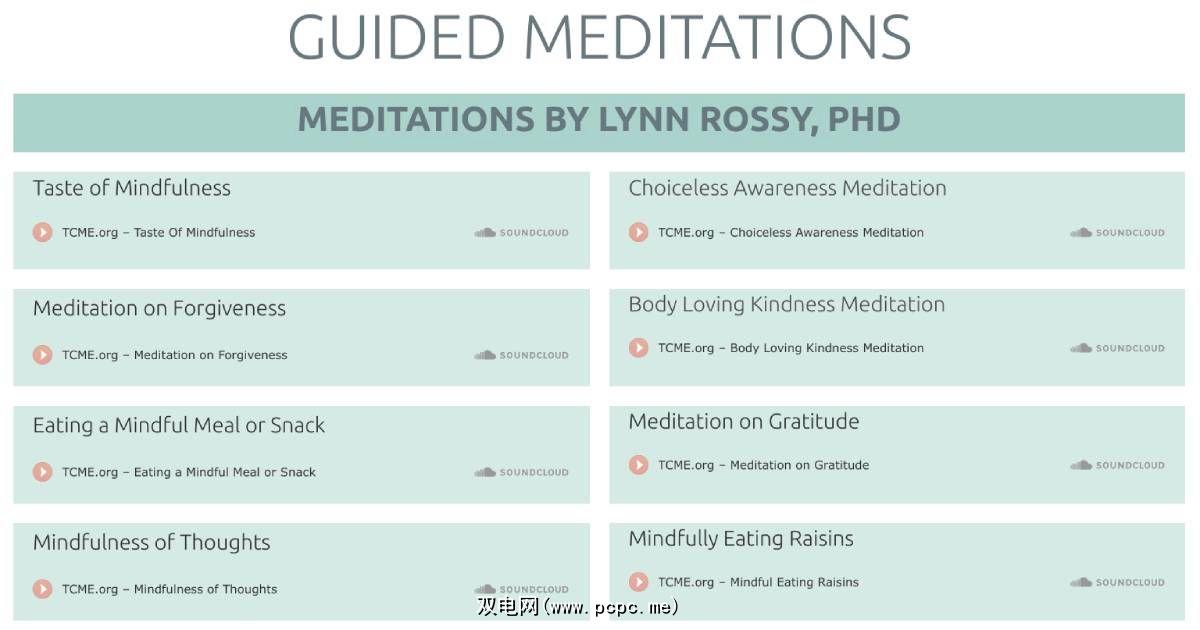 在 TCME 的免费资源中,您会找到一些引导式音频冥想的列表。主题包括正念的味道、宽恕的冥想、吃正念的饭菜或零食、思想的正念、无选择的意识冥想、爱身体的善良冥想、感恩的冥想、正念地吃葡萄干和对饥饿的正念探索。所有这些都可以免费在线流式传输或通过 SoundCloud 下载。