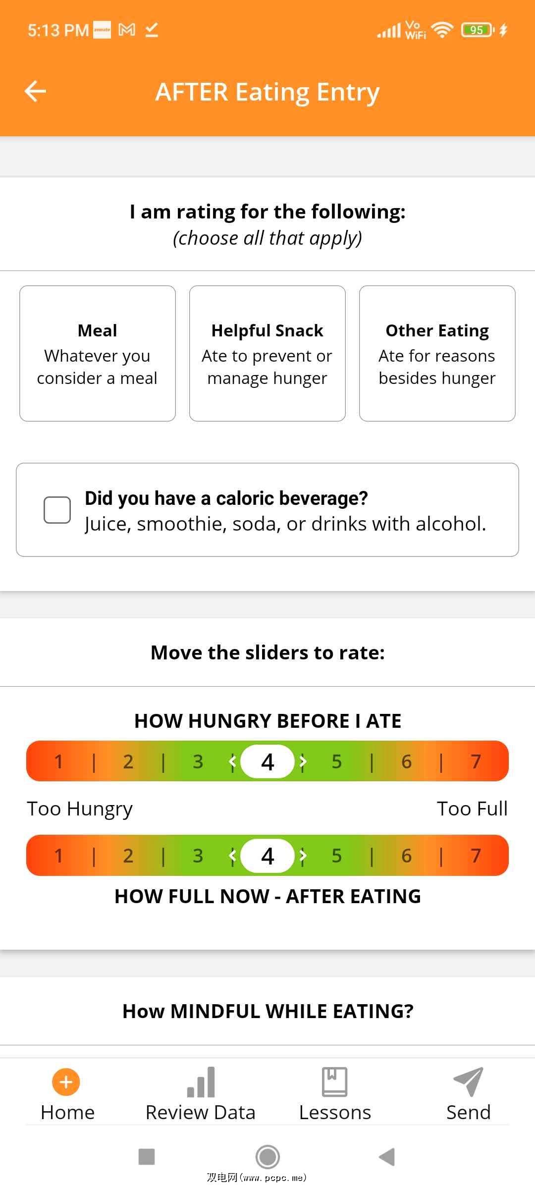 打开应用程序,并在您要吃饭时点击“饭前”按钮。Mindful Eating Coach 2 将带您完成一系列练习和问题,让您的大脑有意识地进食,而不仅仅是被动地进食。它还要求您预测饭后的感受和目标。