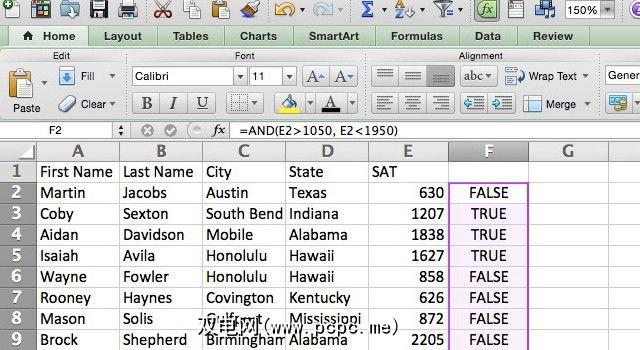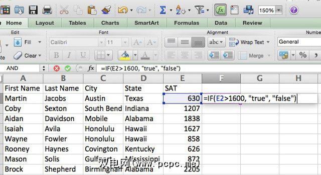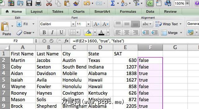 这将为每个学生在F列中输入“ true"得分高于1600,其他人则为“假"。