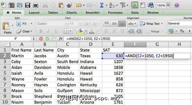 最后的省略号表示您可以包含您可以根据需要选择任意数量的逻辑测试-如果所有这些测试都通过,则AND只会返回TRUE。回到我们的示例电子表格,假设您想查找在SAT的中级得分(介于1,050和1,950之间)的学生。这是我们将使用的语法: