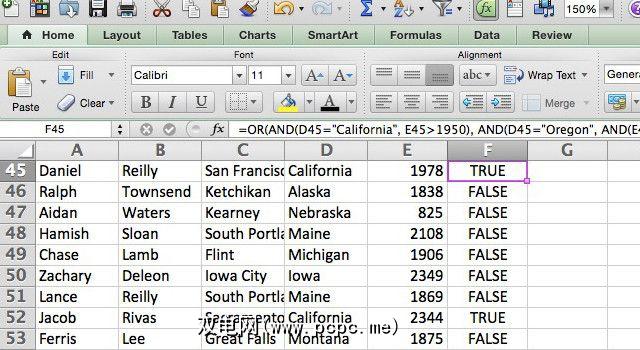 第一个AND参数包含两个简单的逻辑测试。第二个AND参数具有嵌套的AND函数,因此仅当学生来自俄勒冈州且得分高于1050且低于1950时,它才会返回true。第三个参数包含创建类似要求的OR函数。让我们看看在招聘电子表格上运行此代码时会发生什么情况: