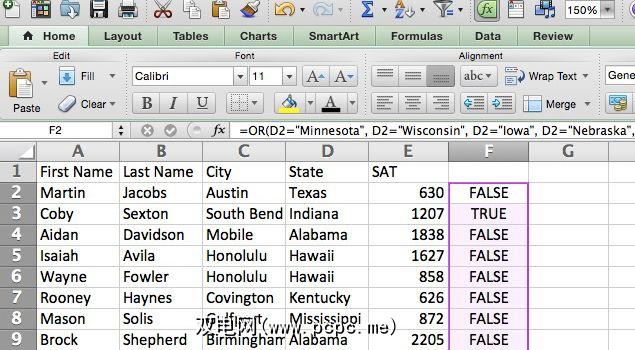 应用到电子表格后,您会看到每个中西部学生现在都被标记为TRUE。