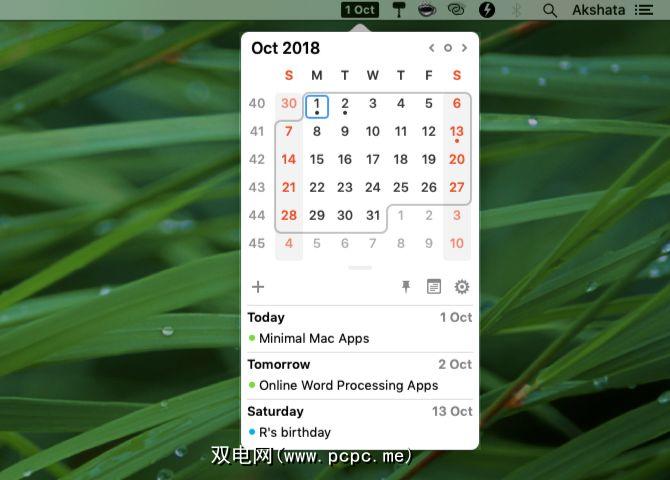 它显示一个迷你日历和一个您即将举行的活动的列表。您可以直接从菜单栏中创建和删除事件,但无法对其进行编辑。您必须打开日历才能编辑事件。