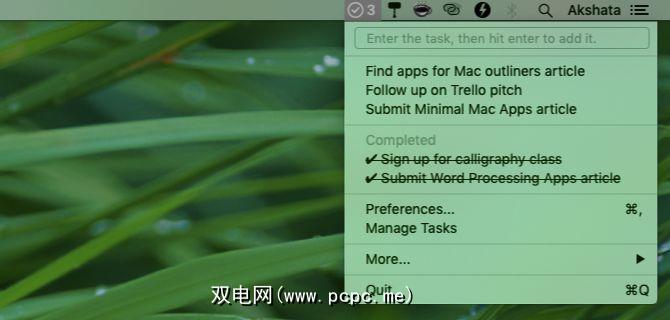 您可以导入/导出任务,也可以重新排列任务,但这是通过单独的面板实现的,这些面板不会出现视线。您在菜单栏下拉列表中看到的只是您的待办事项列表和已划掉的项目。待处理任务的数量显示在该应用程序的菜单栏图标旁边。