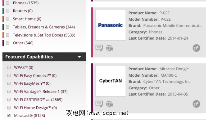 “高级产品搜索器"在左侧的过滤器中有一个Miracast选项。进行检查,然后使用类别或搜索框找到您的小工具。