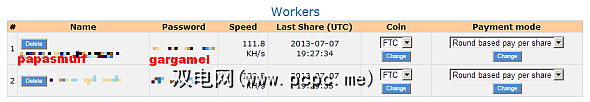 添加“工作人员"需要输入密码和用户名,包括机器名称。例如,如果您在Coinotron上的用户名是“ papasmurf",而您将机器指定为“ gargamel",则机器的用户名将是“ papasmurf.gargamel",您将在以后的GUIminer中输入该用户名。请注意,下面的屏幕截图有点过头,“ papasmurf"是用户名,“ gargamel"是采矿设备的名称。