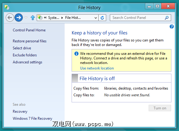 新的文件历史记录功能取代了先前的版本以及Windows备份和还原。与以前的版本不同,默认情况下未启用文件历史记录。文件历史记录还旨在与库和台式机中的文件以及联系人和收藏夹一起使用。它比“以前的版本"功能有更多限制,“以前的版本"功能适用于文件夹中的任何文件。
