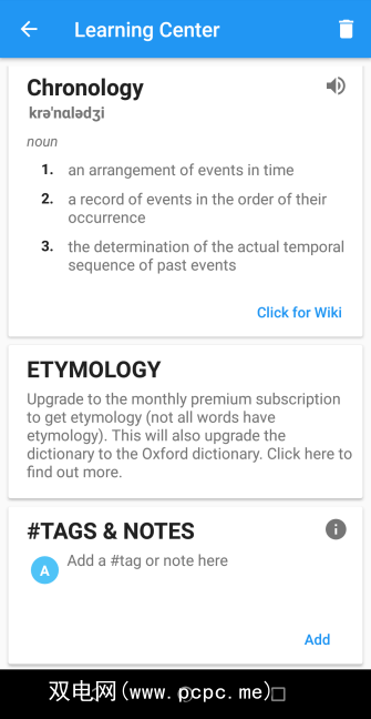 您可以从任何应用程序将单词添加到词汇表中。选择任何单词,按三点菜单,然后点击词汇表。或者,您可以通过共享菜单共享单词。该单词将添加到我的列表标签中。点按该单词时,您会看到详细信息,包括定义,Wiki链接,同义词,例句以及可搜索的注释或标签。
