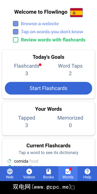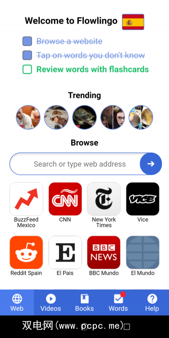 Flowlingo使用沉浸技术来帮助您学习语言。您会找到用于网站,视频,音乐,书籍的单个标签,以及一个用于学习单词的标签。选择目标语言后,该语言会显示很多内容。例如,它包括从BuzzFeed,CNN,Wikipedia等指向流行网站的链接。
