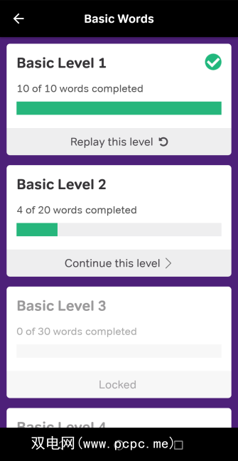 选择一个部分后,该应用程序具有多个类别( 基本,中级和高级)以及每个类别中的级别。在每个级别上,应用程序都会询问您多个选择问题。您所要做的就是选择正确的含义。不用担心,如果您回答的问题有误,这是学习过程的一部分。