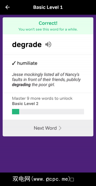 该应用程序使用间隔重复技术,这意味着它会定期向您询问相同的问题,直到您掌握它们为止。您还可以与随机用户互动,玩逐字游戏,其中Vocabulary Builder随机选择20-25个困难单词。您的目标是在时间用完之前正确回答这些问题。