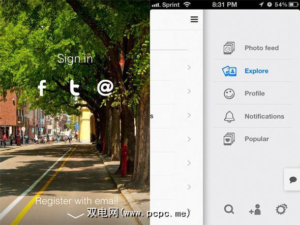 使用电子邮件注册新帐户后地址,或者只是使用Facebook或Twitter登录,您就可以直接使用该应用程序提供的许多功能。菜单包含5个部分:照片供稿,浏览,个人资料,通知和受欢迎。