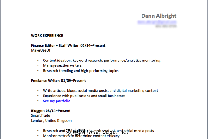 在您的简历中包含一些超链接也对招聘人员很有帮助。从电话复制和粘贴URL比在计算机上花费更多的精力。因此,只需单击一下即可通过电子邮件发送给您,查看您的投资组合或查看您的社交资料。