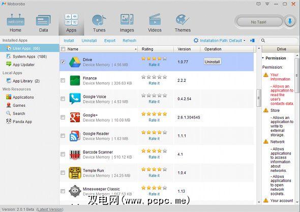 在“应用"标签中,您可以查看设备上当前安装的所有应用,也可以根据需要安装更多应用。 Moborobo也提出了一些建议,但是这些应用程序在Google Play商店中找不到。
