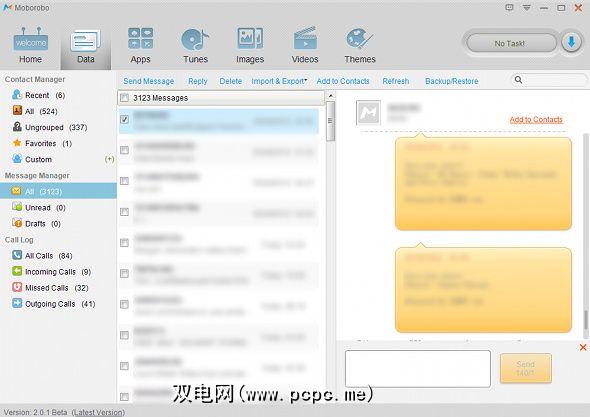 “数据"选项卡的妙处在于,对于文本消息,您可以直接接收通知,阅读和回复消息来自Moborobo。在撰写本文时,直接从Moborobo发送消息时存在时间戳错误,但是我敢肯定它将很快得到修复,总体而言,这是一个很棒的功能。