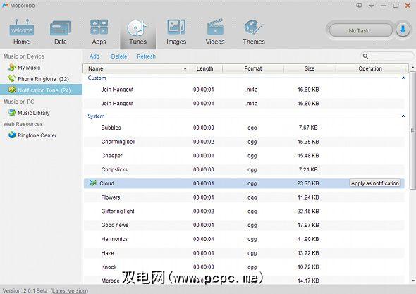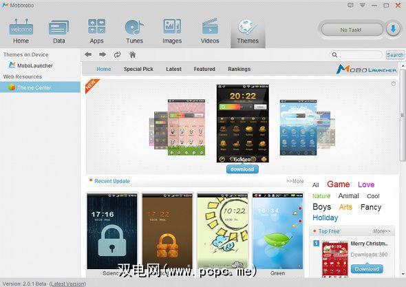 最后但并非最不重要的,Moborobo提供了一些主题,这些主题可以将计算机上的音乐,图像和视频同步到设备。您可以申请您的设备。请注意,这些主题是为Mobo Launcher设计的,可替代您当前使用的任何家用Launcher。如果您想尝试一下,则需要在左侧面板中单击Mobo Launcher才能将其安装到设备上。