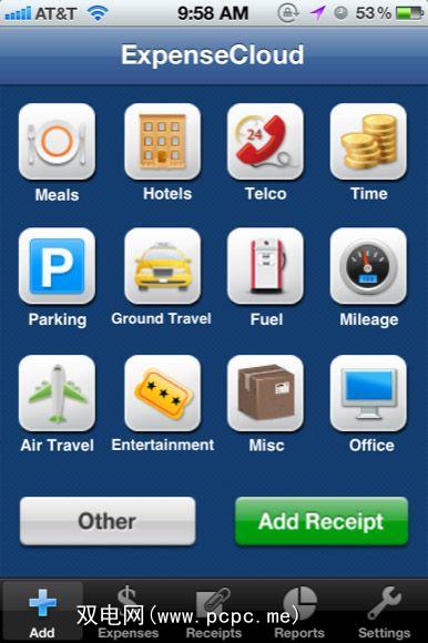 ExpenseCloud是一款适用于iPhone,Blackberry和Android的跨平台移动应用。注册帐户后,您可以直接开始使用ExpenseCloud。主屏幕用户界面包含一组简单的数据输入按钮,用于记录停车,酒店费用,里程,娱乐,航空旅行,膳食和其他费用。