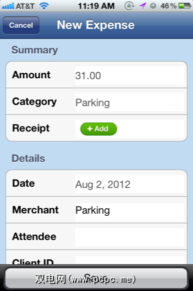 点击类别,您会发现可以手动添加费用,该费用包括金额,日期和商家的数据字段,以及费用是可开票还是预付款。如果您要出国旅行,则还可以指示您使用的货币。