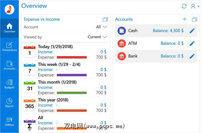 Perfect Accounting Assistant是另一个出色的Windows应用程序,用于预算您的钱。与其他帐户一样,您也有现金,借记卡或其他特定帐户。因此,添加您的收入,选择一个类别,并包括日期。您也可以为丈夫或妻子等其他家庭成员增加收入,以获取完整的家庭预算。