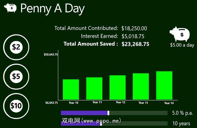您可以将利息从1%调整为10%,并查看调整后最上面的总额。而且,如果您看到要实现的目标,则可以将详细信息另存为CSV文件。 “ Penny A Day"是一个简单而出色的工具,可帮助您查看和设定储蓄目标。