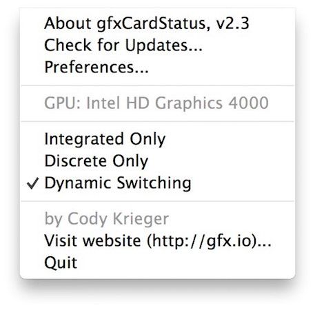根据开发人员的说法,gfxCardStatus“允许MacBook Pro用户使用耗电量更大的图形来查看哪些应用正在影响其电池寿命"。因此,它是一款可告诉您MacBook Pro使用的显卡的应用程序(集成的``软件''或离散的``硬件''加速)。如果您发现Mac使用的是错误的版本,则可以切换到所需的版本。这使您能够改善系统性能和电池寿命。