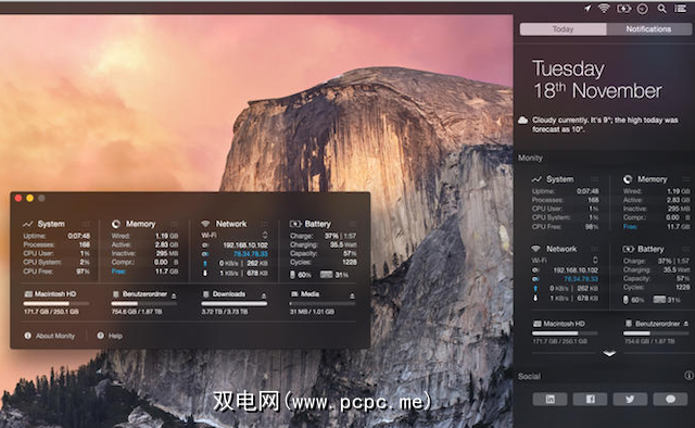 如果您是Notification Center的忠实粉丝,那么Monity将会吸引您,因为它完美集成。安装后,只需打开Notification Center,单击底部的编辑,然后单击Monity旁边的加号即可。这应该适用于不喜欢菜单栏中停靠图标或项目的任何人。