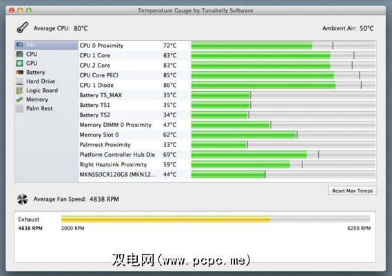 就像内存清理,温度计仅具有一个目的-提供Mac的所有可能温度。它会在Mac上的每个温度传感器上保留标签,并在温度过高时提醒您。您可以看到风扇旋转的速度有多快,所有活动都记录到一个.CSV文件中-便于解决与热有关的问题。