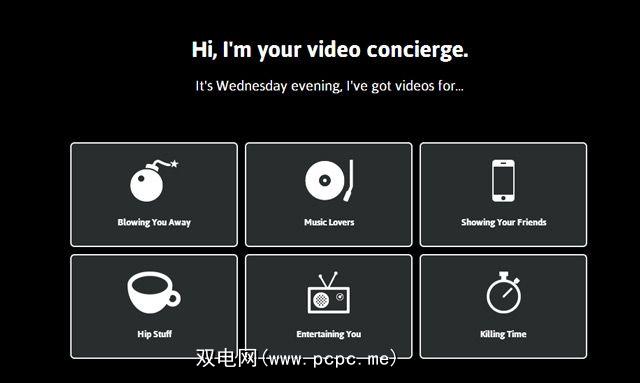 选择“杀死时间"之类的选项会将您带到常规类别,如下屏幕所示。单击任何一个都会自动从YouTube或Vimeo加载视频。此时,用户无法选择要观看的精确视频,因为该视频是从5By.com背后的团队策划的许多视频中提取的。随意浏览时无意间发现视频是有趣因素的一部分。如果您正在观看视频,那么您也可以将其中一些标记为“以后观看"。