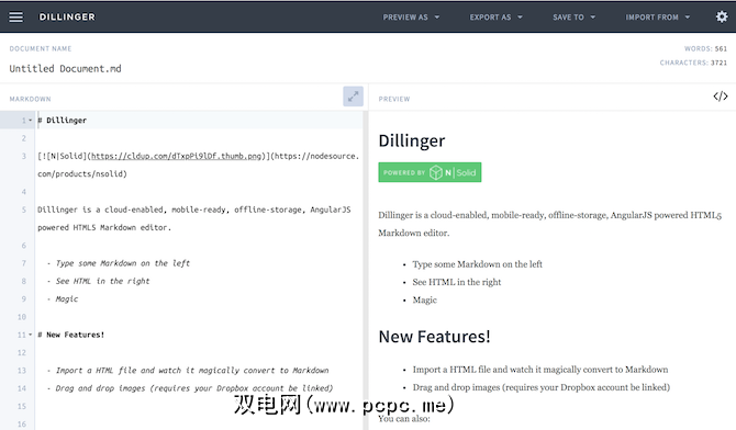 Dillinger是启用了云的在线HTML5 Markdown编辑器。它适合移动设备并提供离线存储。使用Dillinger,您可以将纯净降价标记导出为HTML,拖放图像等等。 Dillinger非常适合博客作者和开发人员。