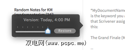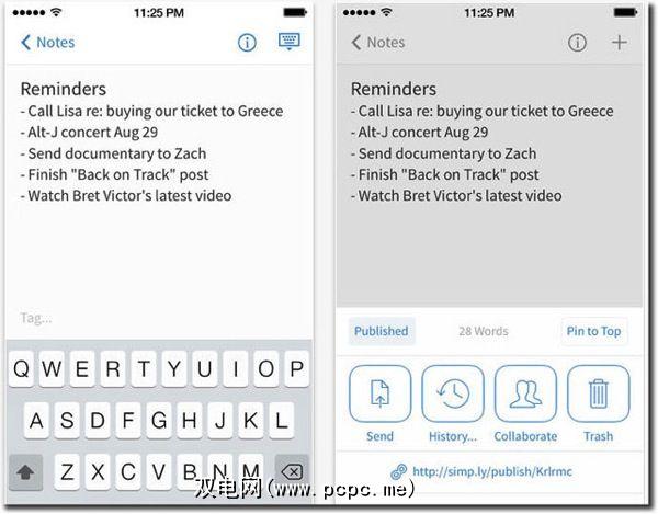 类似地,选择发布到Web…可以快速共享文档。 Simplenote为您提供了一个可以共享的简短链接。这个简单的文本编辑器还具有历史记录功能,我发现它比Apple的TextEdit和Pages应用程序中的相同功能更易于使用。单击 History (历史记录)按钮时,它会弹出一个版本滑块,该滑块可以滚动回到编写文档时所做的各种保存的更改。单击恢复按钮以保存所需的版本,或复制并粘贴要重复使用的特定文本。