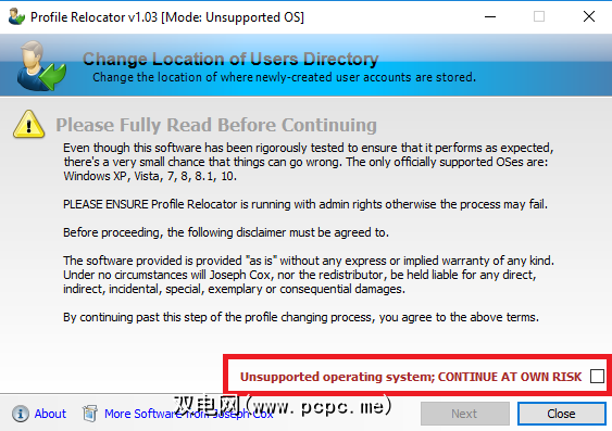 运行该应用程序时,您会看到一条消息,内容为“不受支持的操作系统,请自行承担风险。" 您可以忽略警告,然后单击复选框。