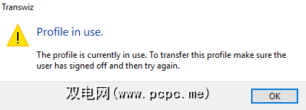 如果主机上只有一个用户配置文件,则必须创建另一个。该应用程序无法转移当前正在使用的配置文件。尝试这样做将强制应用程序显示以下错误消息:“当前正在使用配置文件。要传输此配置文件,请确保用户已注销,然后重试。"