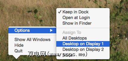 这里有个提示,您可能不知道:您实际上可以分配要在特定应用程序上启动的应用程序监控。在扩展坞上,右键单击任何应用程序的图标,然后将鼠标悬停在“选项"上。您会看到将应用程序分配给特定显示器的选项: