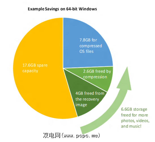 在Windows 10中有所改变。WIMBOOT压缩算法与Windows 10完全集成。它也有一个新名称: CompactOS 。 CompactOS可以节省的最大潜力是消除恢复分区,该分区大约需要4GB的空间。但是,当制造商包括自定义恢复分区时,通常会在其中装有bloatware并窃取甚至更多的宝贵存储空间。