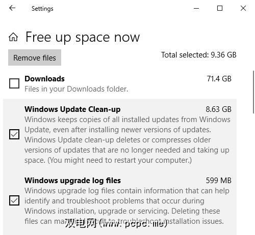 在开始中输入免费菜单搜索栏,然后选择最佳匹配。在存储空间下,选择立即释放空间。 Windows 10会自动计算您可以删除多少个临时文件,包括Windows.old文件夹。确保选中 Windows Update清理框。您还可以删除 Windows升级日志文件,因为它们会占用更多空间。