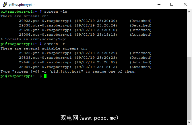 screen -rd您可以运行多个Screen会话。如果您想重新连接到特定的会话,则需要找出会话进程的ID号。键入 screen -ls 或 screen -r 列出它们。