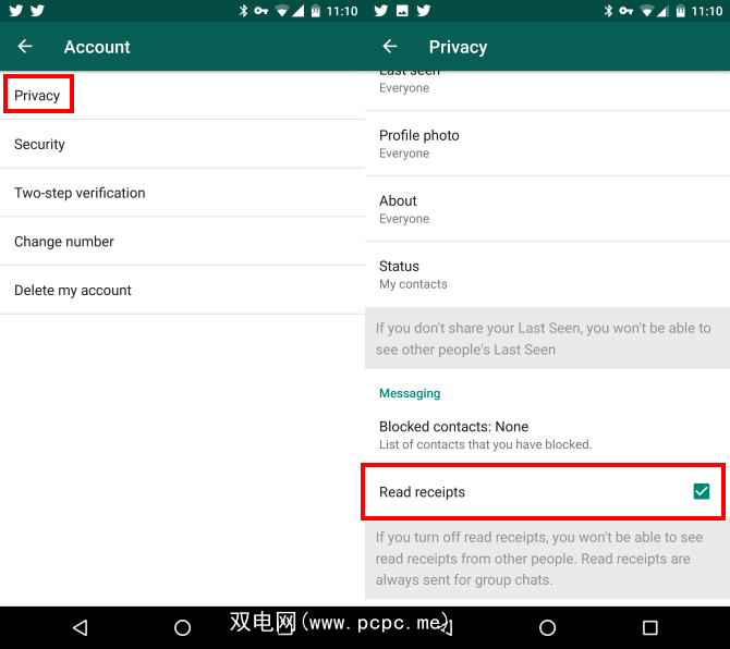 默认情况下,WhatsApp发送已读回执以让其他人知道您已经看到了他们的消息。如果您不想共享此信息,可以禁用已读回执以保持隐身状态。打开WhatsApp,然后按右上角的三点式 Menu 按钮,然后依次点击 Settings (Android)/按下 Settings 齿轮右下角(iOS)。然后,转到帐户>隐私。